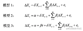 为了保证DF检验中随机干扰项的白噪声特性Fuller提出了增强的DF检验,即ADF检验。ADF检验是通过如下三个模型完成的(笔者不想打公式了!直接上图片):