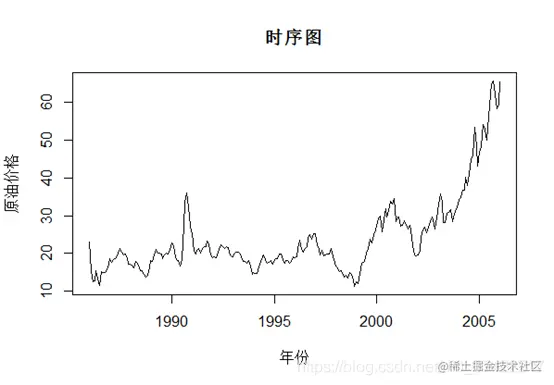 当我们观察一个时序图时,仅因序列的一部分看似线性递增(或递减),不足以确信过程具有内在的线性特征,并长期保持下去。比如,下面这个原油月度价格图: