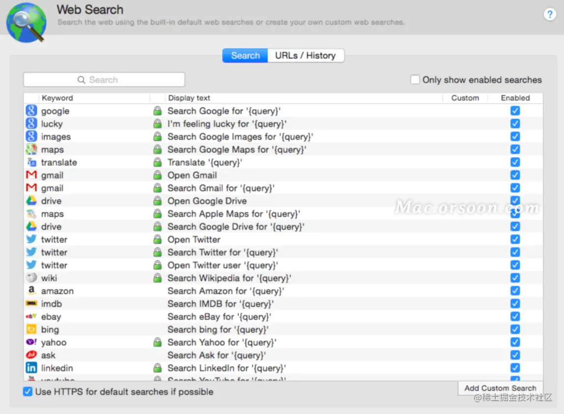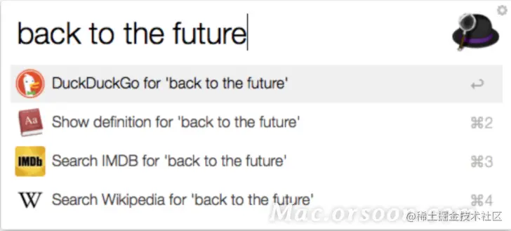 默认的后备搜索是 Google、维基百科和亚马逊,它们是流行的网络搜索。但是,Powerpack用户可以自定义这些以使用 Web 搜索、自定义搜索和工作流程的任意组合。