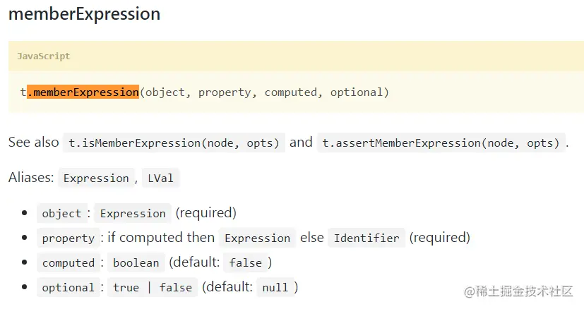 好了,先来创建MemberExpression类型的console.log,此处对于新手会比较棘手,推荐好好观察在线的AST树进行反推,找到目标节点的type,接着在@babel/types文档里搜相应type的方法;如图,我们在文档里搜到memberExpression方法的定义,接着开始创建console.log节点;