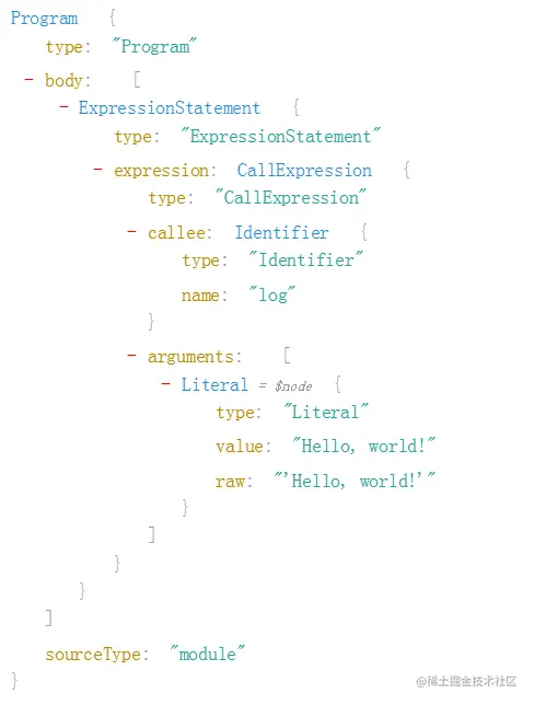 在astexplorer.net网站里我们可以在线将代码转为AST,如下图:log('Hello, world!')的AST树形结构图;