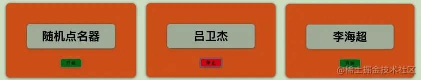 - 当点击开始按钮时,JS 程序中提 前准备好人员(数组)名单会随机变换跳动显示,开始按钮变成了停止按钮, 如第二张图显示;