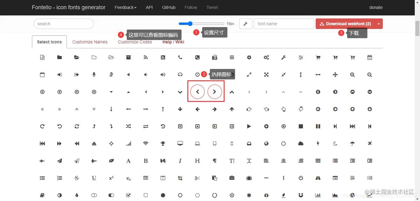 1)进入官网fontello.com/(可选其他网址),选择尺寸、图标,并进行下载: