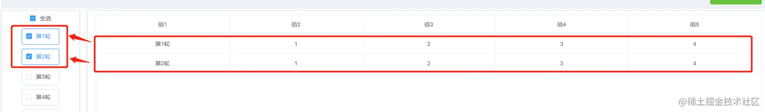 js的methods里实现全选及单选功能,并根据多选框选项动态更新表格数据;若选中其中一项或多项,则表格新增对应的一条或多条数据;如果全选,则新增全部数据: