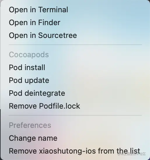 XcodeProjects可以便捷执行Pod操作、清除derived data、自定义命令等,更多看这里