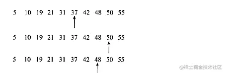 如有5,10,19,21,31,37,42,48,50,52这10个数,要查48这个数,其查找过程: