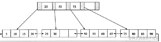 如下:其高度为2,每页存放4条记录,扇出(fan out)为5。所有记录都在叶子节点上,并且是顺序存放的。