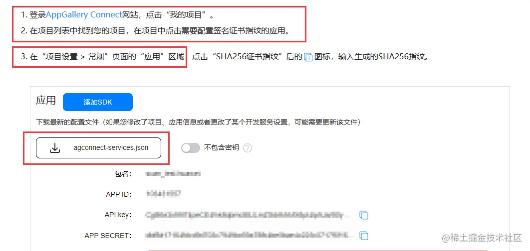 2、 Android Studio集成SDK的:重新下载agconnect-services.json文件(下载路径参考下图),并放在应用工程根目录下: