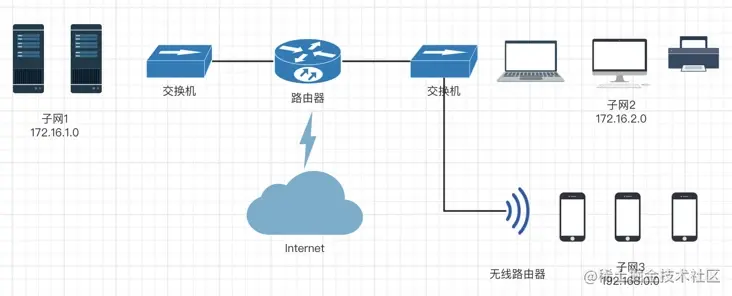 互联网是一个庞大的分层网状结构,亿万的设备分布在其大大小小的子网中。这里我们展示了一个简化的办公网络,包括3个子网,子网间通过路由器相连,子网内部使用二层交换机或无线热点连接了一些电脑和办公设备。