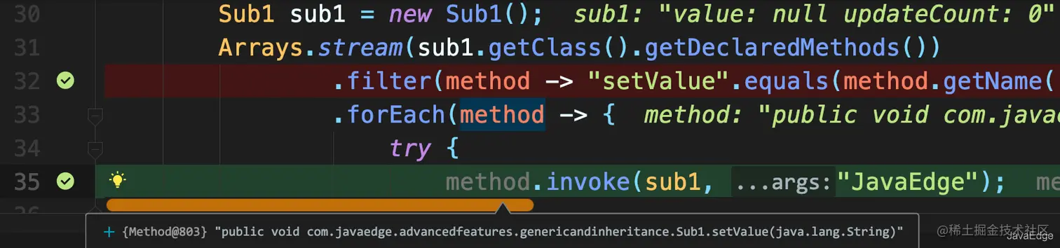 setValue竟然调用了两次,难道是JDK反射有Bug!getDeclaredMethods查找到的方法肯定来自Sub2;而且Sub2看起来也就一个setValue,怎么会重复?