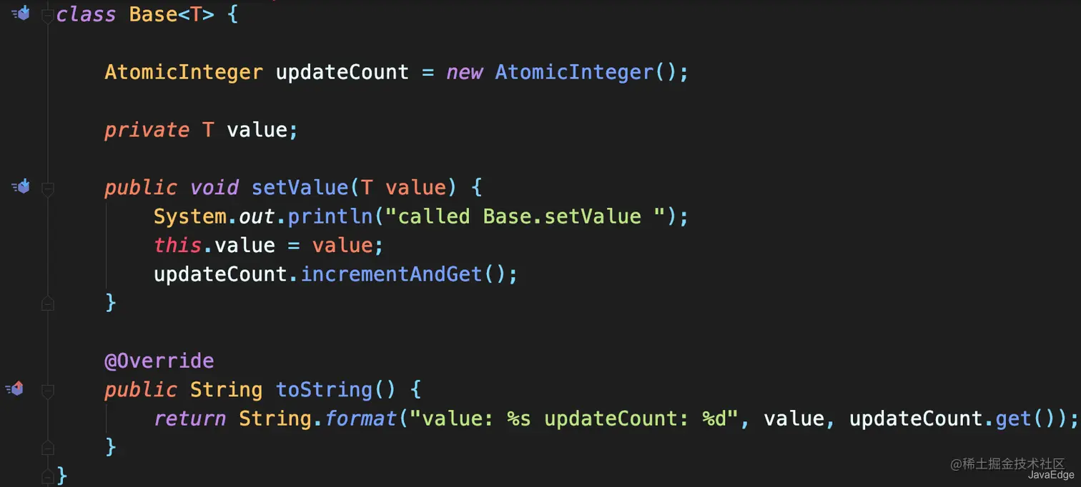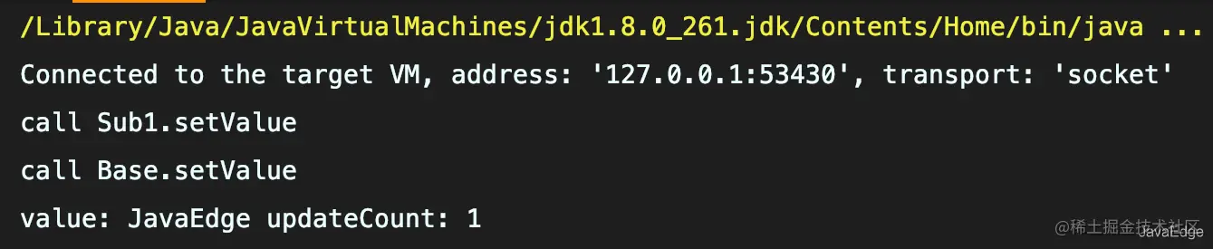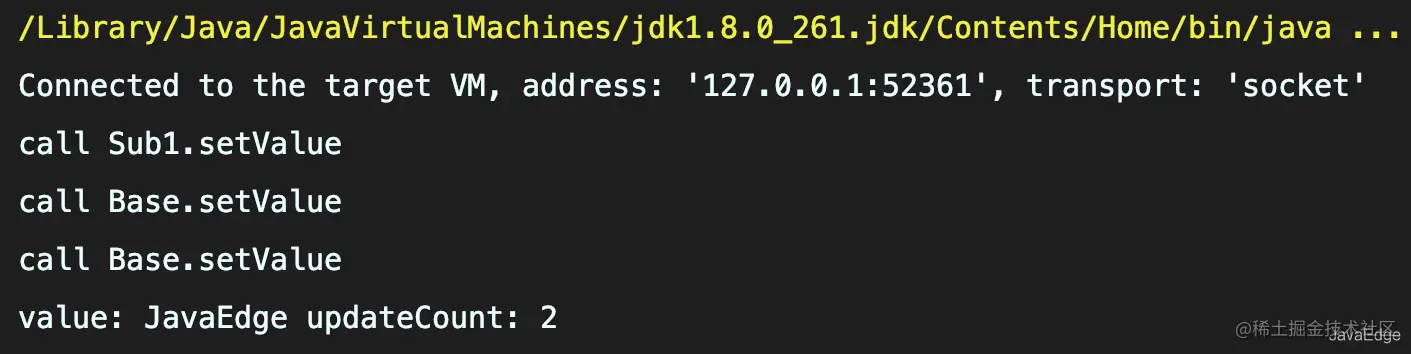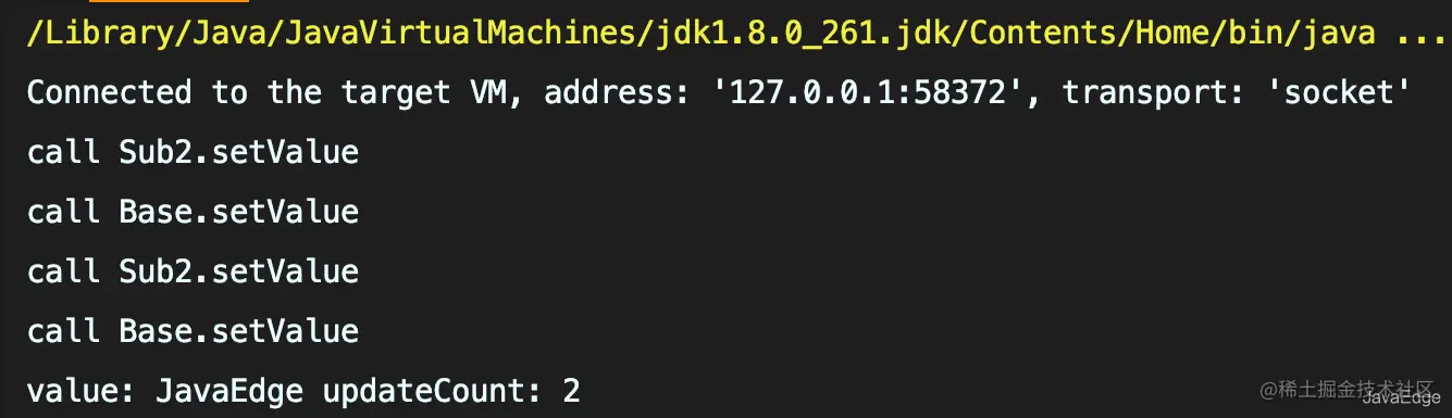 虽Base.value正确设置为了JavaEdge,但父类setValue调用了两次,计数器显示2