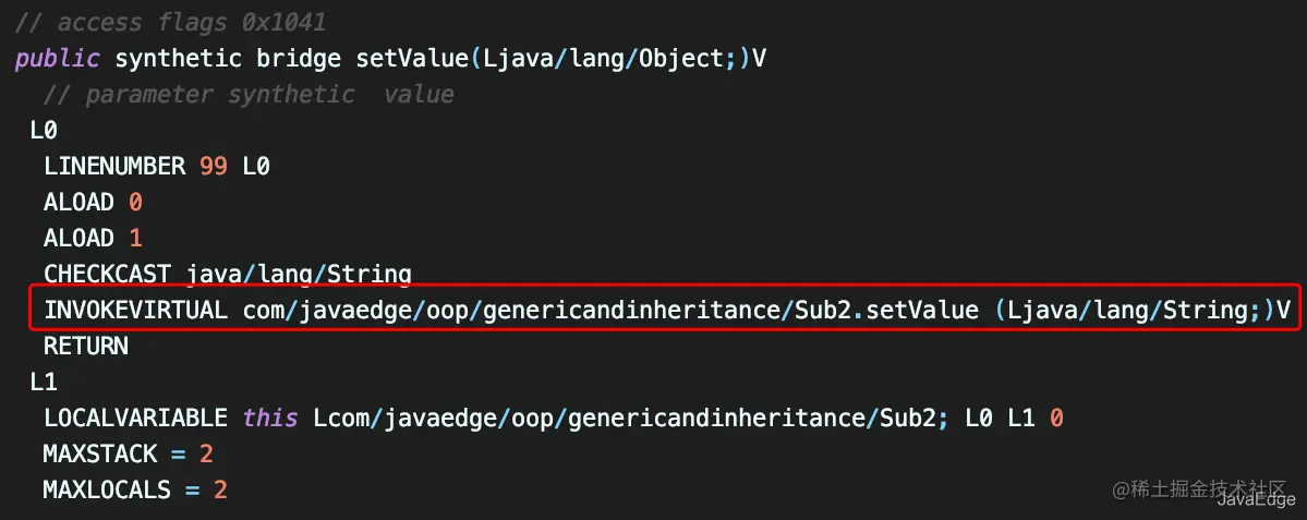 10: invokespecial #5 // Method com/javaedge/oop/genericandinheritance/Base.setValue:(Ljava/lang/Object;)V
