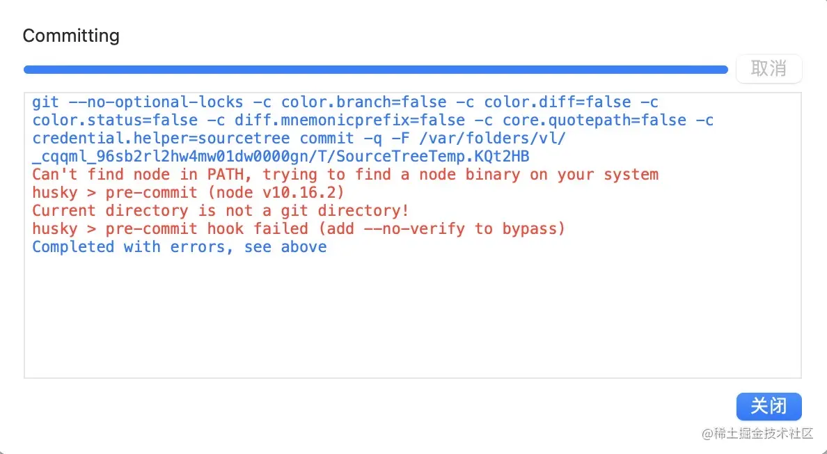 SourceTree 提交无法找到 Node 段月 2021-07-01 1,014 阅读1分钟 通过终端正常提交,SourceTree 无法正常提交 由于在提交是触发命令行工具,SourceTree 无法找到命令行工具导致的 1. 通过绕过校验的方式(这种方式不推荐,相当于取消提交校验) 2.通过设置路径,使 SourceTree 找到命令行工具 首先获取 node 路径,在终端输入 which node /usr/local/bin/node 设置项目下的 .git/hooks/pre-commit 中添加 export PATH="/usr/local/bin:$PATH"