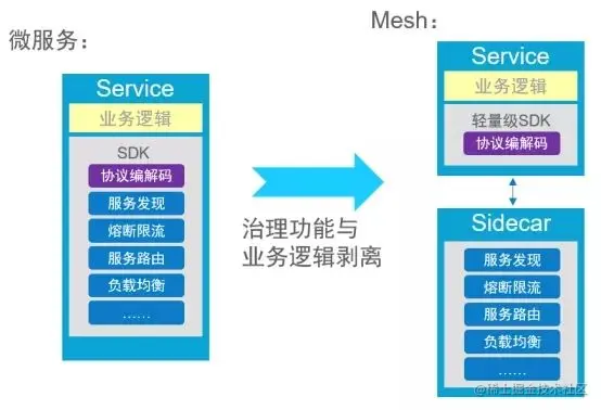 传统微服务框架以 SpringCloud 为例,开发的时候需要引入 SpringCloud 相关的所有依赖,也就是将通信部分包到了引入的依赖(SDK)里,当然这也考验开发人员的能力,需要开发人员熟悉 SpringCloud 框架才能用,并且目前只支持 Java 语言。服务网格类的框架,说来也简单,就是把上面的 SDK 拿出来,单独运行,只要能实现该 SDK 的功能,目的也就达到了,而抽出来单独运行的 SDK 称之为 Sidecar,在服务网格的管理中属于数据面的管理。