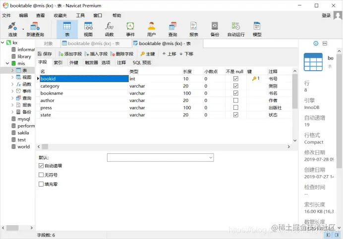另外booktable表格中的category属性参照bookcategory表当做外键
