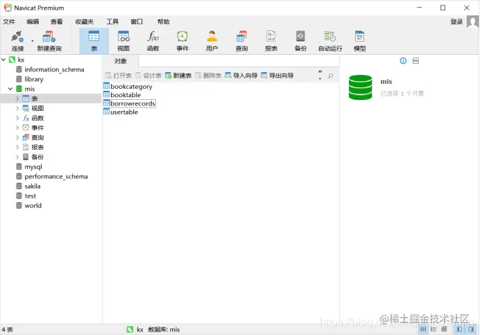 我的数据库用的是Mysql 8.0.16 版本的对数据库没要求都可以,在建表写代码过程中为了方便使用了Navicat Premium 12连接数据库建表。项目文件夹中有mis数据库的.sql文件,只需在自己的数据库中创建mis数据库将.sql文件导入mis数据库即可