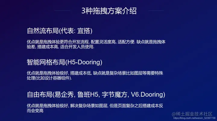 第二种是我们H5-Dooring采用的这种智能网格布局方案,它的优势是我们开发者可以去通过拖拽来更轻松的搭建一个组件、页面,但缺点就是无法去对一些更复杂的层级组件进行实现,比如图层或者图片之间的叠加,或者对多个组件之间的灵活度,有着非常高要求的场景。
