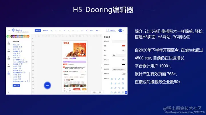 H5-dooring是去年下半年,开源的一个低代码平台,主要的目的是方便用户快速搭建一个简单的低代码项目,从2020年下半年至今,Github上已经有4500+stars,同时有50+家企业、1000+用户基于H5-dooring生成页面。