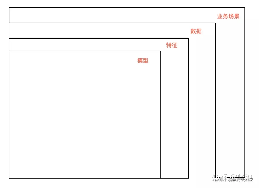 这是一张层层镶嵌的矩形图,矩形的大小代表了这个模块的上限。每一个矩形的右上角都有一个标识,代表这个这个矩形块的具体含义。而从外层向内层,分别是业务场景、数据、特征、和模型。