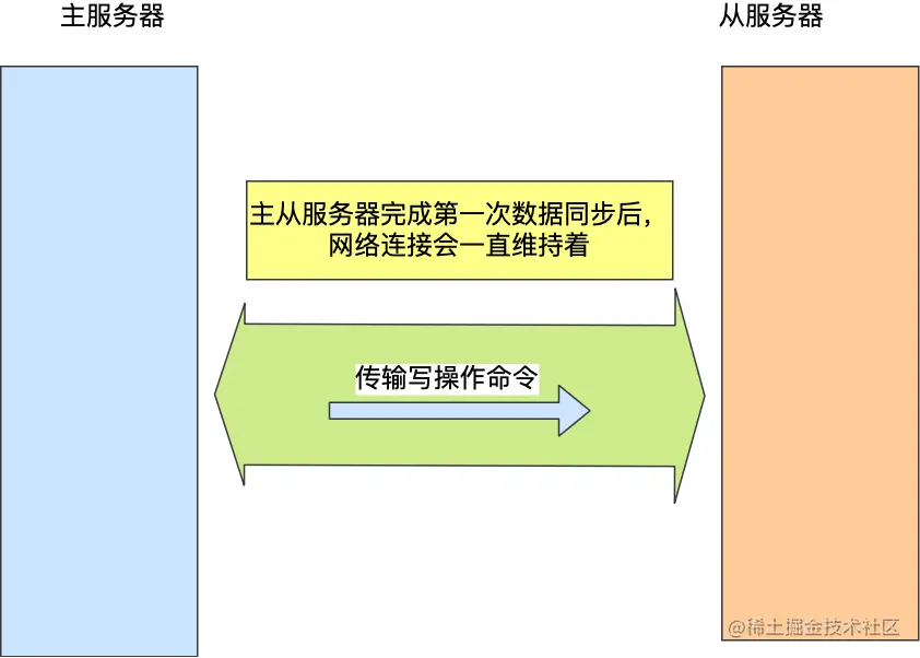 第一次同步完成后,主从服务器都会维护着一个长连接,主服务器在接收到写操作命令后,就会通过这个连接将写命令传播给从服务器,来保证主从服务器的数据一致性。