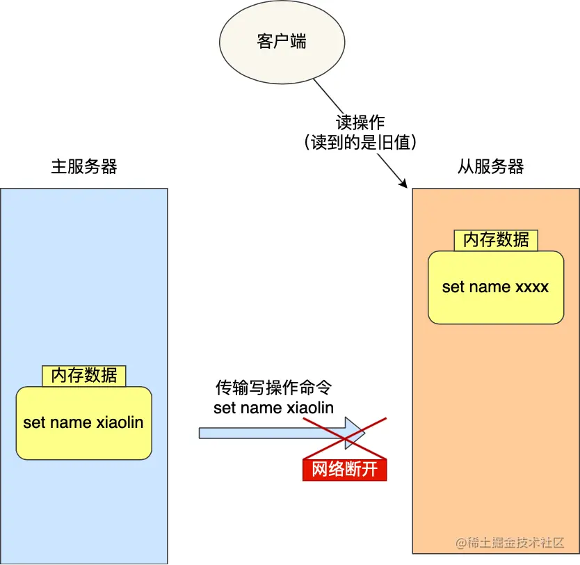 如果主从服务器间的网络连接断开了,那么就无法进行命令传播了,这时从服务器的数据就没办法和主服务器保持一致了,客户端就可能从「从服务器」读到旧的数据。