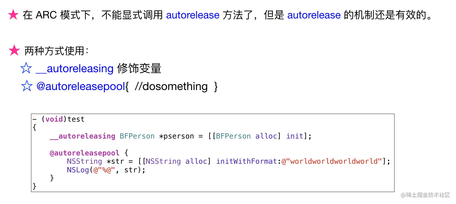 不管是MRC,还是ARC下,自动释放池的机制都是相同的,不同的关键字所代表的含义也是一致的。比如autorelease和__autorelease,@autoreleasepool{},但需要注意的是NSAutoreleasePool和前面几个机制不一样。