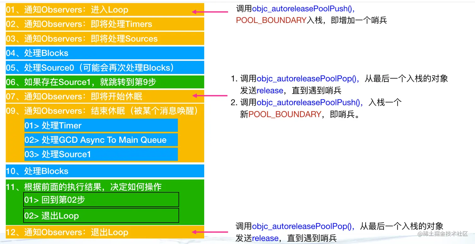 - 即将进入休眠:会调用objc_autoreleasePoolPop() 和 objc_autoreleasePoolPush() ,根据情况从最新加入的对象一直往前清理直到遇到哨兵对象。