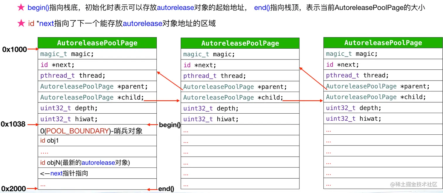 `AutoreleasePoolPage`这个"池子"负责了所有的`autorelease`对象的管理,每个Page除了存放自己的成员变量之外,其余空间用来存放`autorelease`对象,如果当前Page不够存储,会新建Page,并进行双链表的连接,然后将`autorelease`对象存储在新Page。而`next`指针则指向了下一个存放`autorelease`对象的地址。