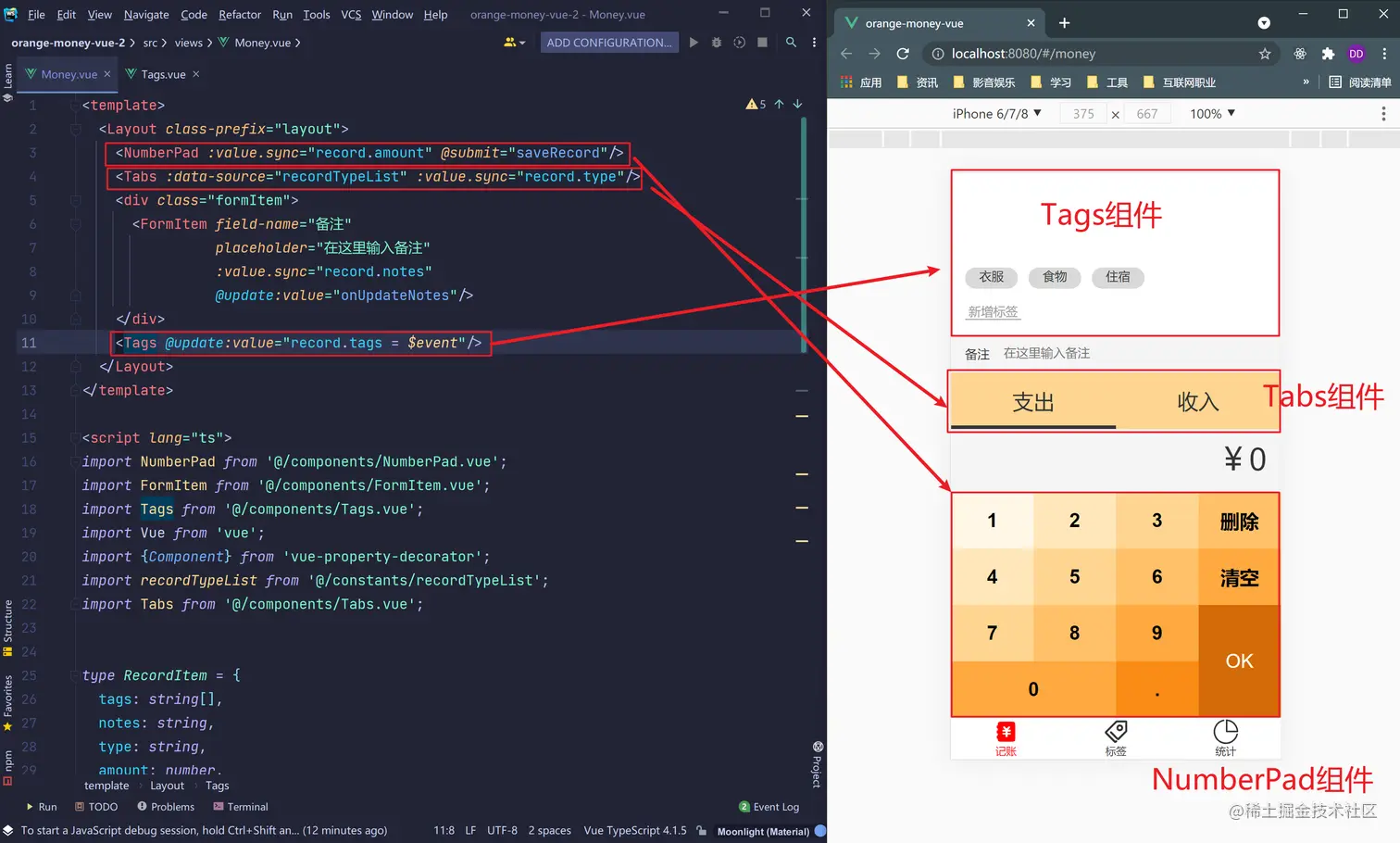 在下图中,Money.vue 文件由 NumberPad.vue、Tags.vue、Tabs.vue 等多个子组件构成。