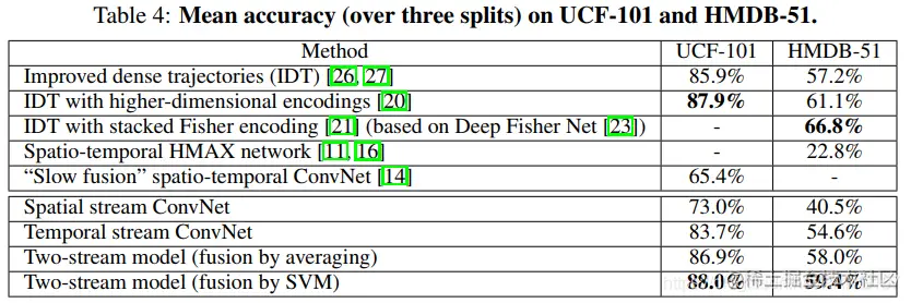 结论:对于卷积网络的融合,采用SVM分类器融合要比取平均的效果更好,双向光流没什么效果。(我就说搞不懂它有什么意义,事实证明,真的没啥用,论文原文说的:using bi-directional flow is not beneficial in the case of ConvNet fusion;)