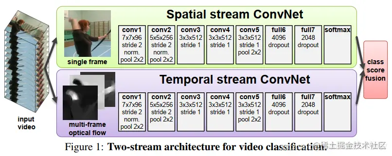 1.提出了一个双流卷积网络模型,其包括了空间网络和时间网络。