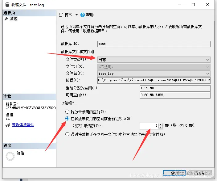 DBCC SHRINKFILE (test_Log, 1); --收缩数据库到1MB