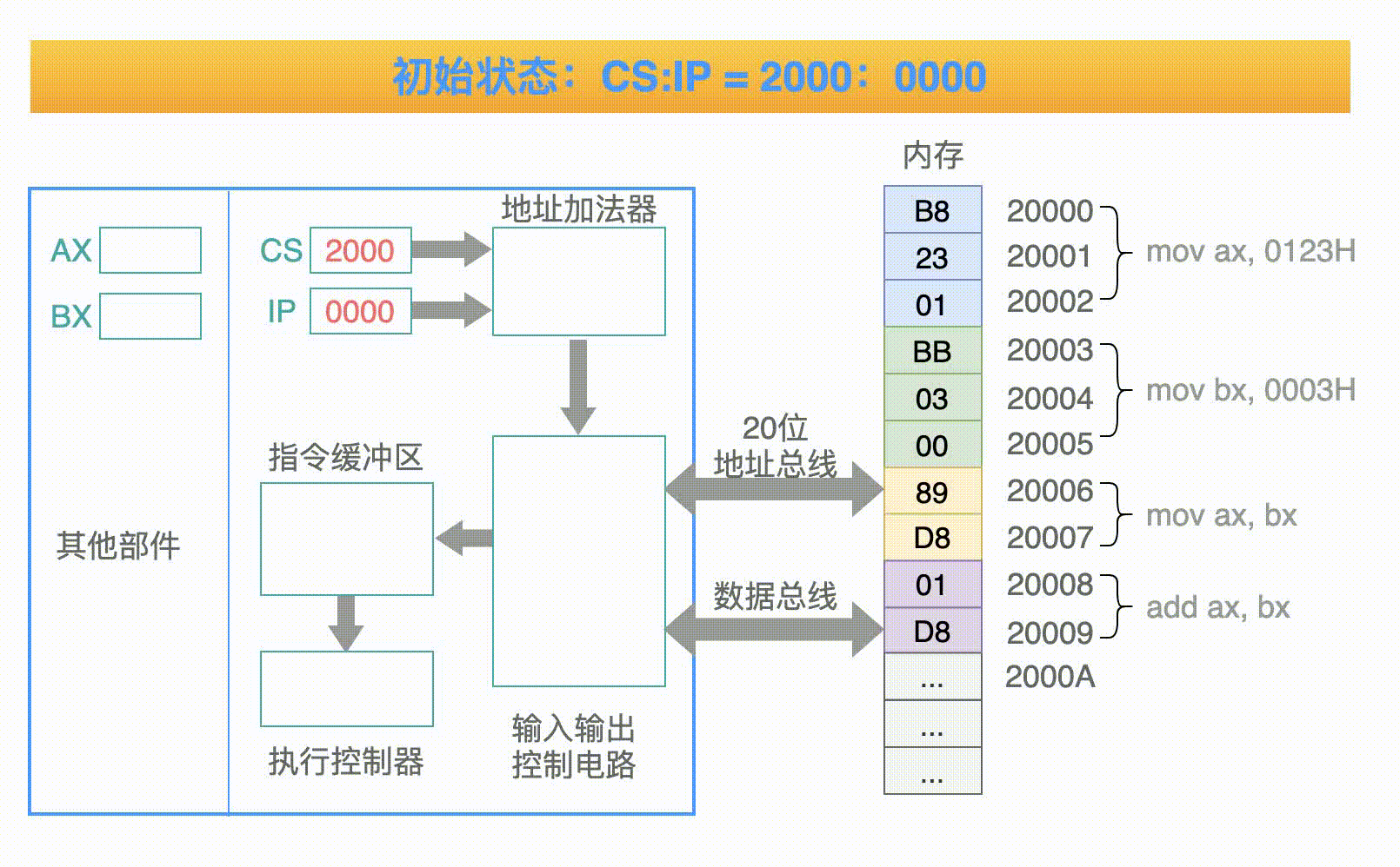 CPU 在执行这些指令的时候,把 CS 寄存器当做段寄存器,把 IP 寄存器当做偏移寄存器,然后计算 CS x 16 + IP 的值,就得到了指令的物理地址。