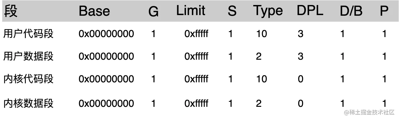 其中的代码段和数据段描述符的起始地址都是 0x00000000,也就是说: 在数值上虚拟地址和转换后的线性地址是相等的(稍后就会明白为什么是这样)。