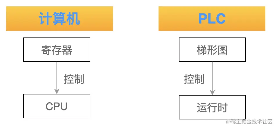 我们再把 CPU 与 工控领域的 PLC 编程进行类比一下。