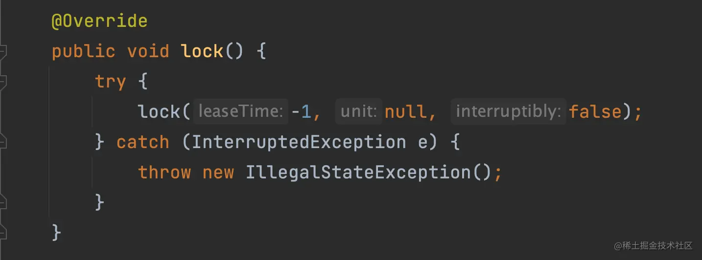 默认加锁,什么参数也没有传递。但是这里会设置 leaseTime = -1。这个 leaseTime 的含义是加锁的时间。