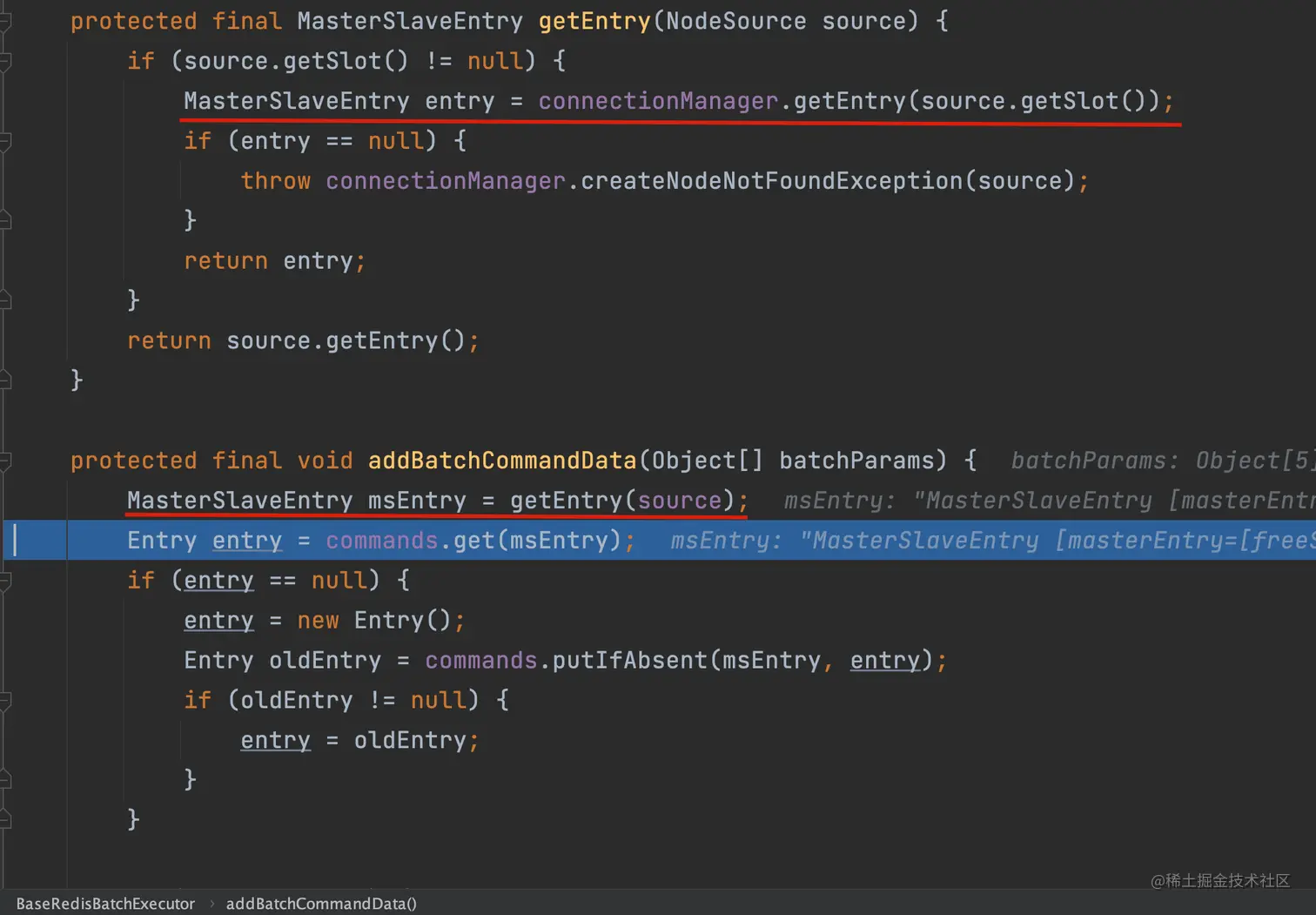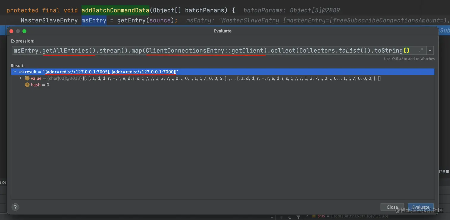 BaseRedisBatchExecutor#addBatchCommandData 在这里会从 source 里面获取到 solt,然后获得 MasterSlaveEntry。