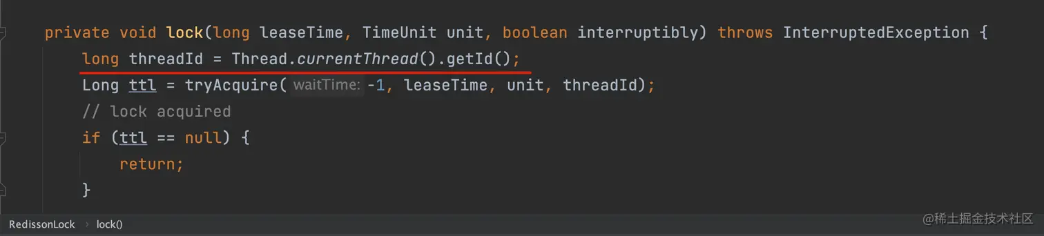 在调用 tryAcquire 方法之前,多了一个参数 threadId,是当前线程的 id,long 型正数。