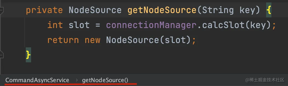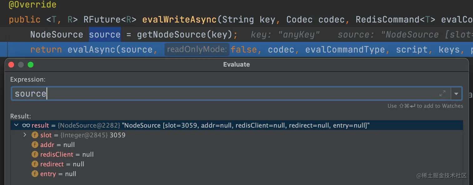 这块代码是在 CommandAsyncService#evalWriteAsync 方法处调用的,是为了获取一个 NodeSource。