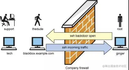 有很多次,我所在的站点需要某人的远程支持,而他却被公司防火强阻挡在外。很少有人意识到,如果能通过防火墙到达外部,那么也能轻松实现让外部的信息进来。从本意讲,这称为 “在防火墙上砸一个洞”。我称之为 SSH 后门。为了使用它,必须有一台作为中介的连接到 Internet 的机器。在本例中,将这样台机器称为 blackbox.example.com。公司防火墙后面的机器称为 ginger。此技术支持的机器称为 tech。图 4 解释了设置过程。