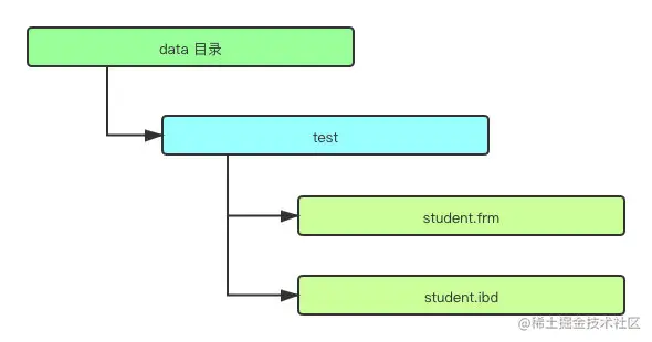 然后我们新建一个叫 test 的 DB,然后在 _data 的这个目录下就会多一个 test 的目录。然后在 test 数据库下新建了一张 student 的表,在 test 目录下就会多出两个文件,分别是 student.frm 和 student.ibd。