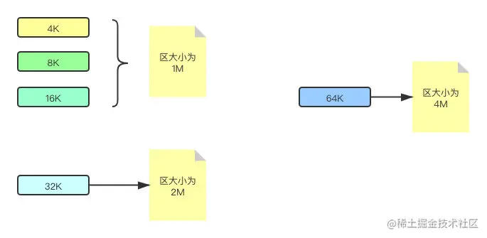 当 innodb_page_size 为 4K、8K或者16K时,其对应的区(Extents)大小为1M;当其页大小为32K时,区大小为2M;当页大小为64K时,区大小为4M。