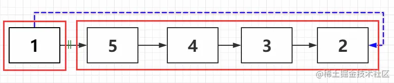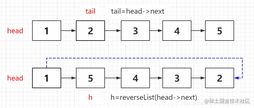 为了实现上面的做法,需要两个指针变量:tail(指向反转部分的尾节点,也就是上图中的2),h(指向反转后链表的头节点,也就是上图中的5)。其中tail=head->next,h=reverseList(head->next)。