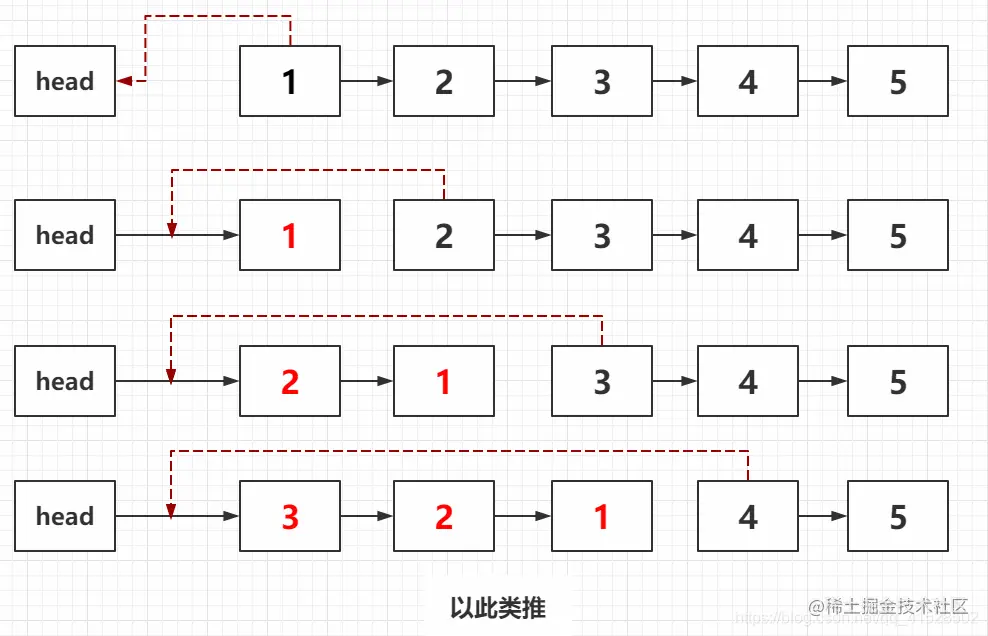 简单来说,就是不断将原先链表的节点依次插入在虚拟头节点head和头节点后面一个节点之间。