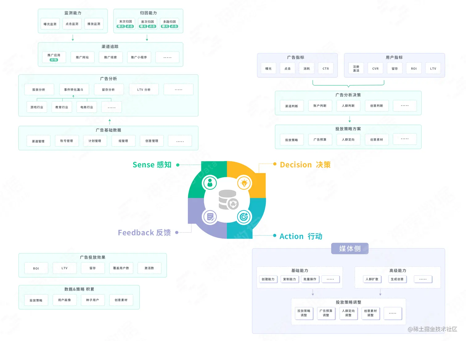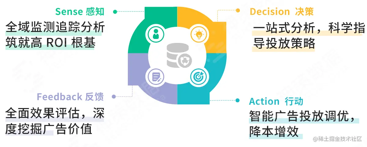基于企业的核心需求,神策数据决定进军广告投放分析领域,颠覆传统广告投放思路与产品,以基于数据流的企业运营框架——SDAF, 即 Sense(感知)、Decision(决策)、Action(行动)、Feedback(反馈)为理论基础,推出基于数据流的广告投放分析新模式,精准解决企业业务痛点,如下图: