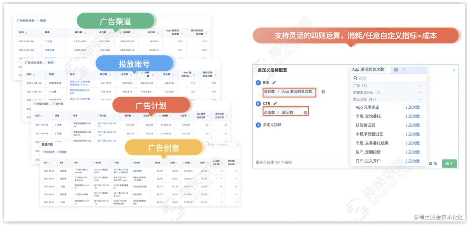 首先,神策数据广告投放分析自主对接数十家主流投放平台,支持一站拉通媒体投放数据 + 用户行为数据 + 投放成本数据 + 分析结果数据,可助力企业通过数据还原广告投放效果,快速定位广告转化中的问题环节,发现优质媒体,为后续策略的优化迭代提供决策依据。
