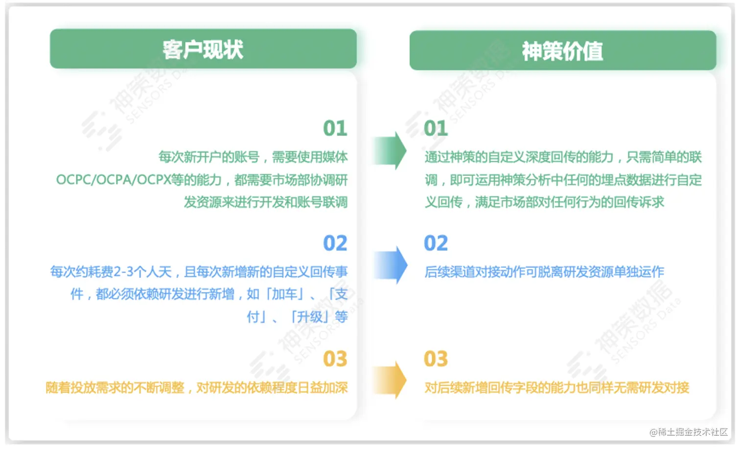 同时,基于神策数据自定义深度回传能力,可极大节省投放人工对接和研发资源投入,显著提升广告投放效率,如下图,是企业现状和神策价值的对比: