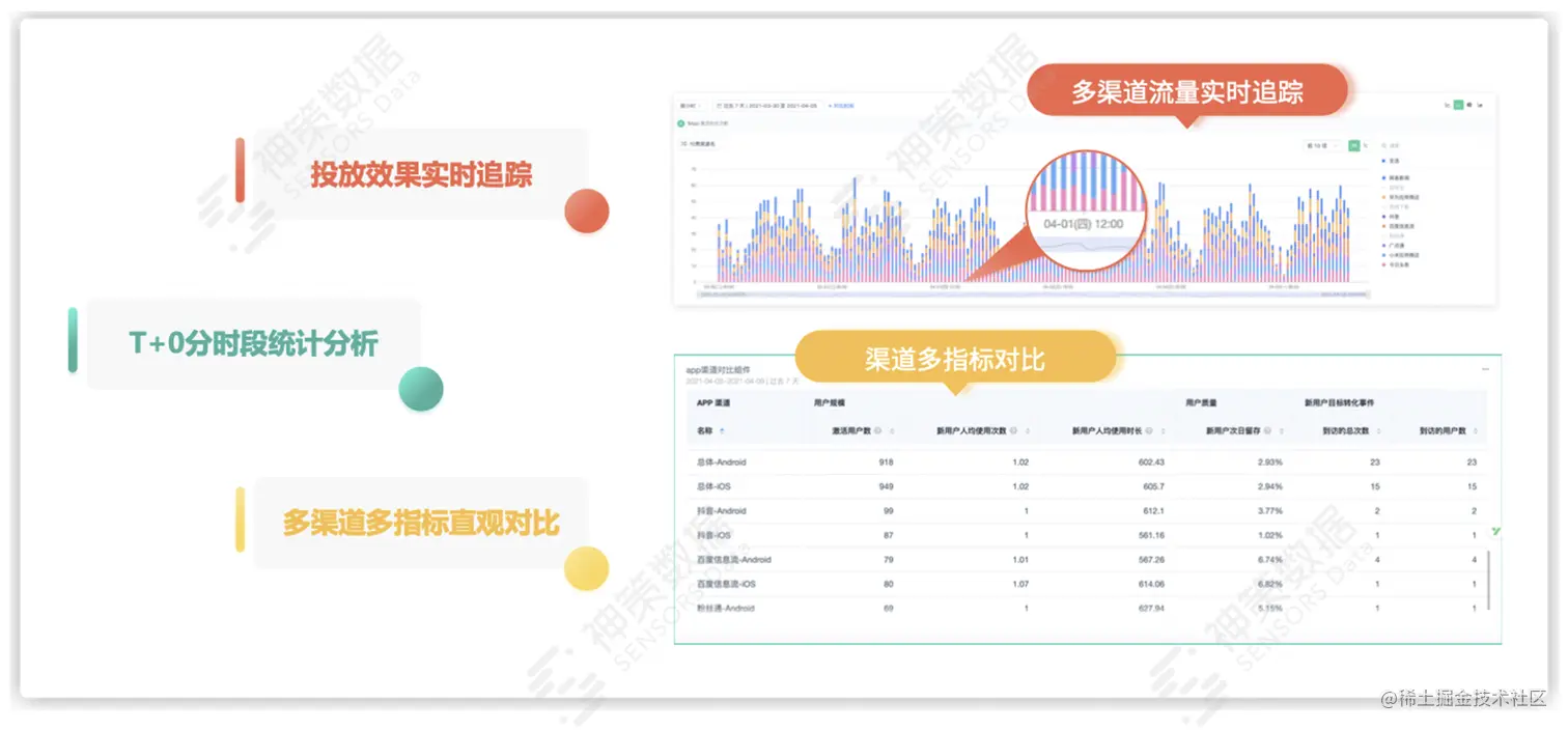 此外,基于神策数据的超强算力集群,广告投放分析可做到海量数据查询毫秒级反馈,实现全生命周期的 T+0 分时段追踪分析,以及多渠道多指标直观对比,有效助力广告主实时洞察投放动态。