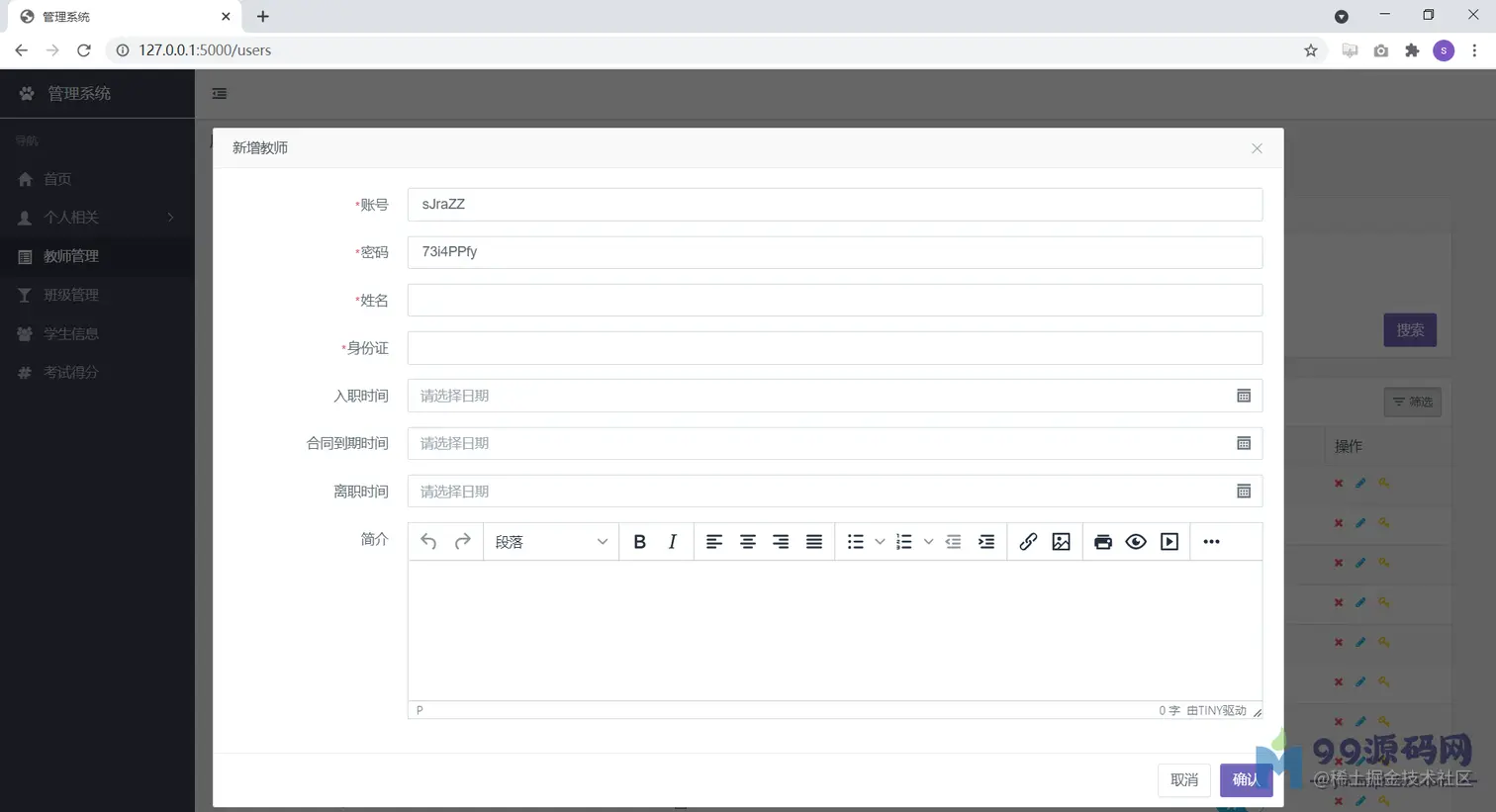 python flask mysql学校管理系统源码 用户2211170275153 2021-07-02 267 阅读1分钟 下载地址:download.csdn.net/download/qq… 项目介绍 python flask mysql学校管理系统源码 适用场景: 毕业论文、课程设计、公司项目参考 运行截图 关注【程序代做 源码分享】公众号获取更多免费源码!!!