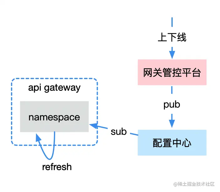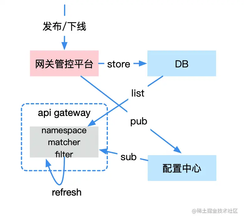 实现上和之前的应用上下线类似,额外依赖了DB存储,用户在管控平台进行api发布等操作会先存储在DB中,随后通过配置中心pub/sub通知到网关。我们在namespace匹配前加入了一层filter以过滤删除/未上线的api,所以热更新该filter对象即可。